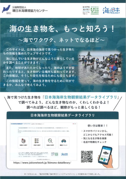 このたび、船の科学館「海の学びミュージアムサポート」の助成を受けて、観察会で集めた生き物の写真や情報をまとめ、スマホやパソコンから手軽に調べられる「日本海海岸生物観察結果データライブラリ」を公開しました。