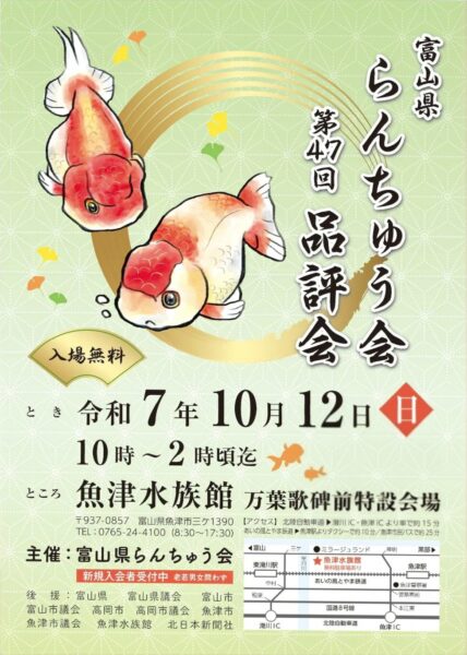 2025.10.07 第47回 富山県らんちゅう品評会開催! 優雅に泳ぐ「らんちゅう」が一堂に会する、年に一度の品評会を開催します。観覧は 無料! ぜひお気軽にお越しください。 日時:令和7年10月12日(日)10:00~14:00頃 会場:魚津水族館 万葉歌碑前 特設会場 主催:富山県らんちゅう会 一覧へ