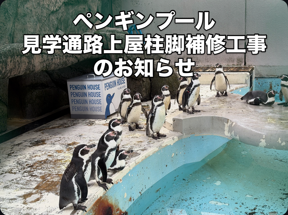 2025.10.08 ペンギンプール見学通路上屋柱脚補修工事のお知らせ 下記のとおり、ペンギンプール見学通路の補修工事を行っております。一部観覧できない場所がありますのでご了ください。なお、ペンギンのお食事タイムは通常通り行っております。 ※工事期間中はお食事タイムでエサを食べない場合があります。 予めご了承ください。 工事予定期間 令和7年10月8日~10月30日 一覧へ