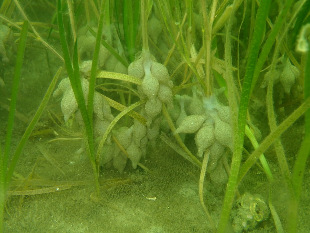 2020年の6月10日、魚津港南地区で潜水調査をしたところ、水深3~4mの砂地で新たなアマモ群落が見つかり、その群落内では、アマモの葉にコウイカとヒメイカの卵塊が産み付けられていました。